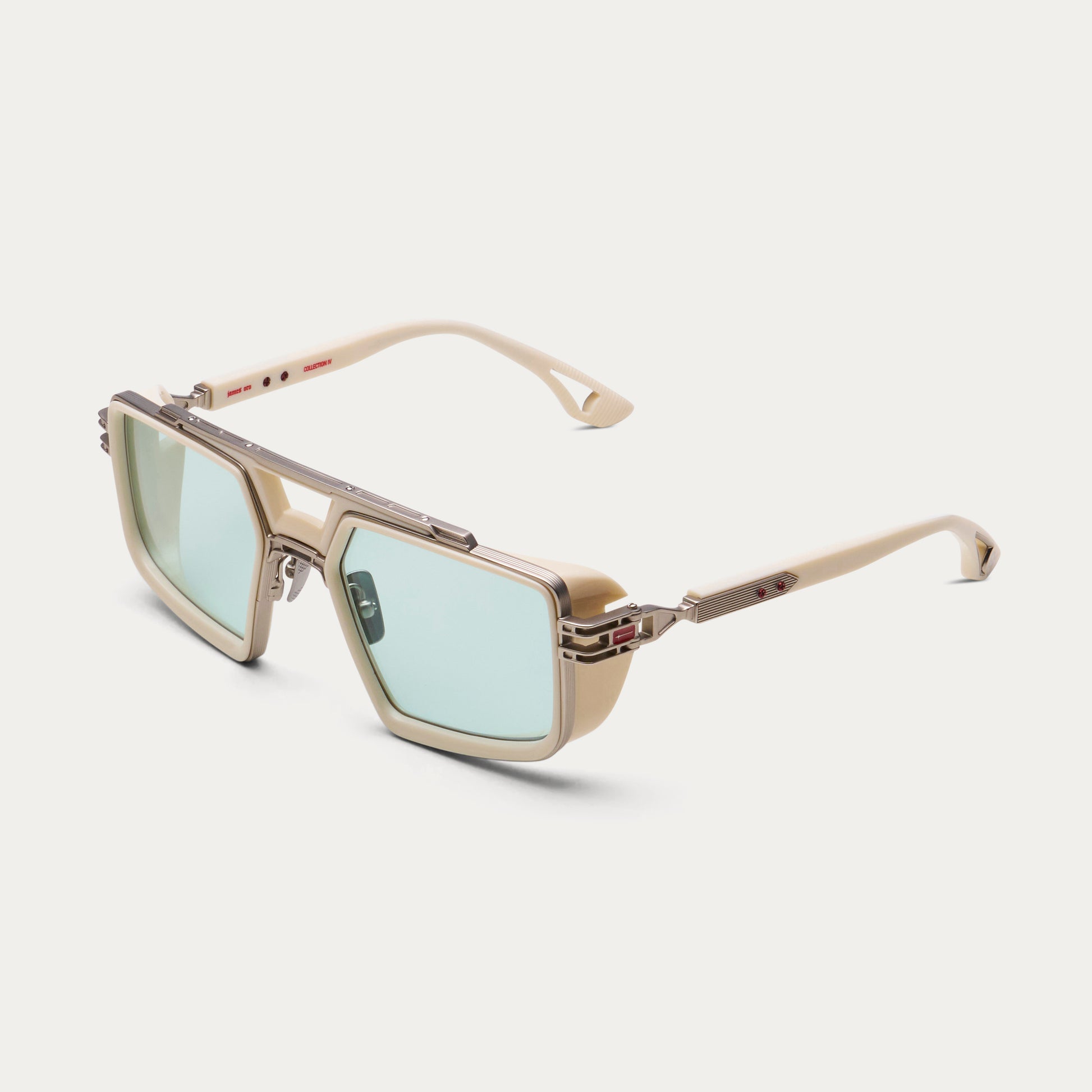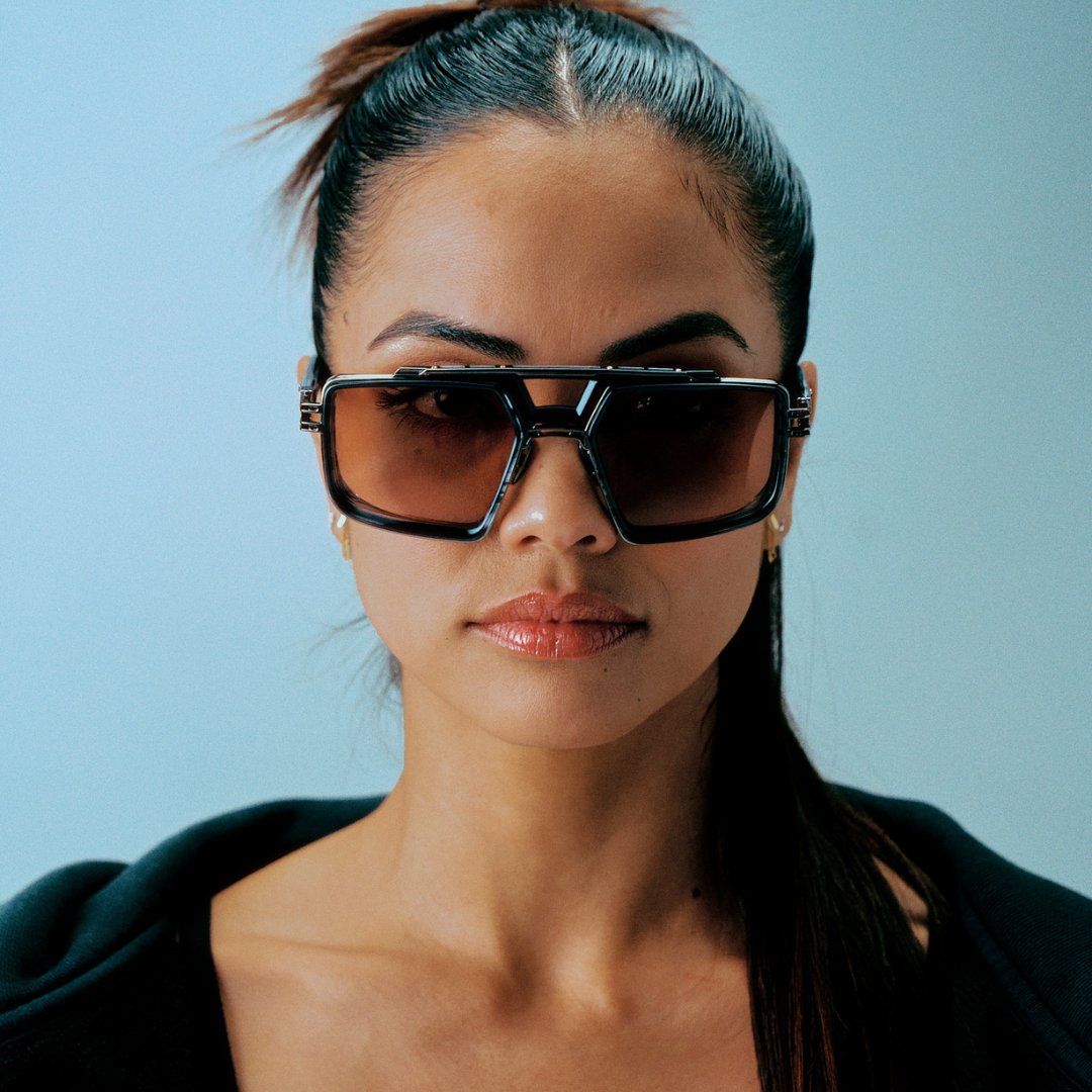 A bold, oversized aviator frame crafted from premium acetate and metal. Featuring custom acetate side blinders, titanium nose pads, and beveled stainless steel temple tips. Finished