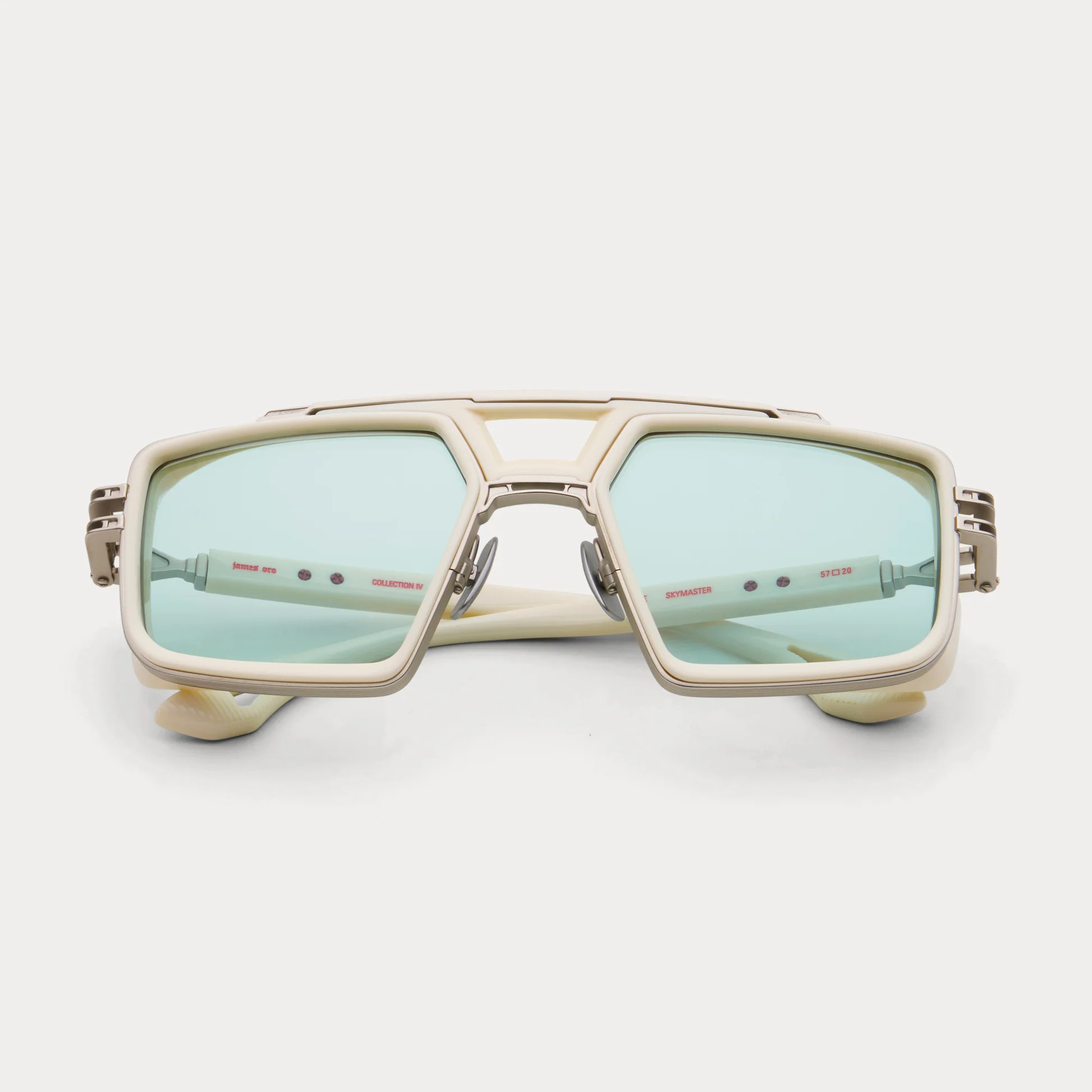 A bold, oversized aviator frame crafted from premium acetate and metal. Featuring custom acetate side blinders, titanium nose pads, and beveled stainless steel temple tips. Finished